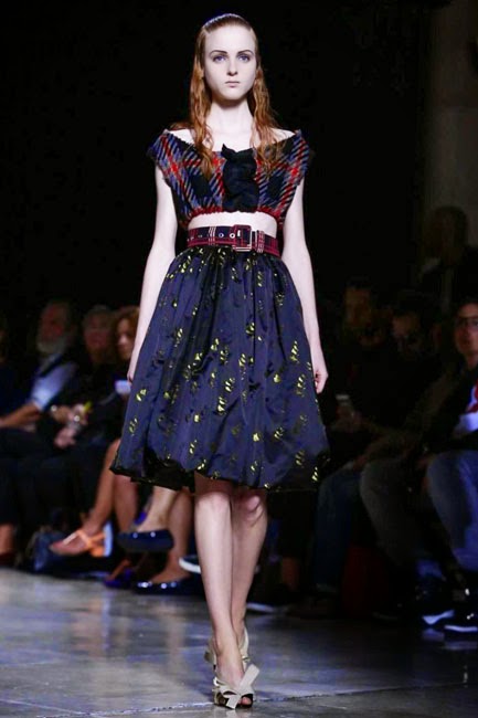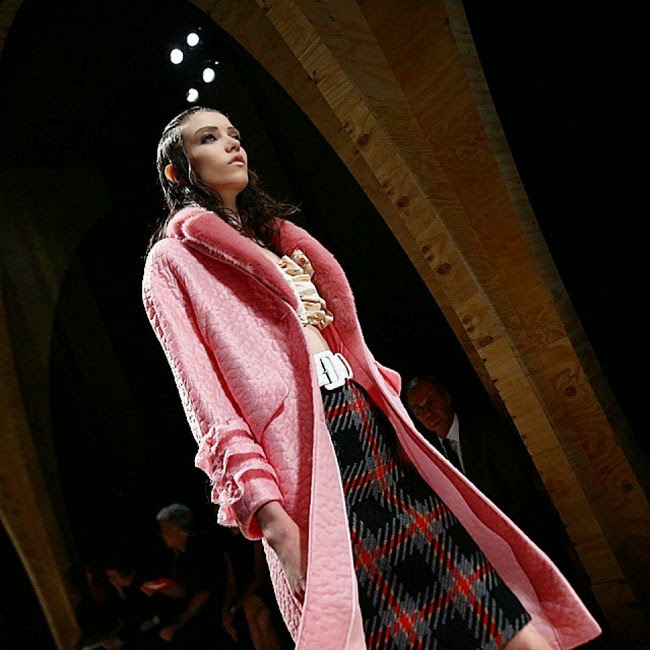 Özellikle pastel ve neon renkli çiçek desenleri ve basma baskılı olan çarpıcı modeller oluşturan Miu Miu belirginliği ile göze çarpan bluz ve sütyenlerin üstleri kırpılmış salyangoz ve fırfırlı modeller ile tüvit kalem eteklerle nadide şekilde yıpranmış ve kırıştırılmış koleksiyonda göz alıcı Paris 2015 Miu Miu tasarım detayları.